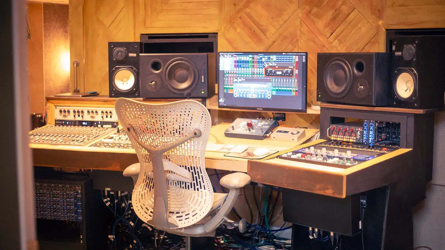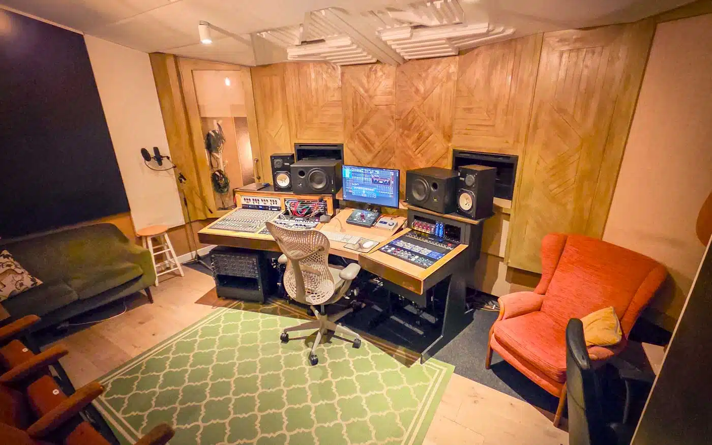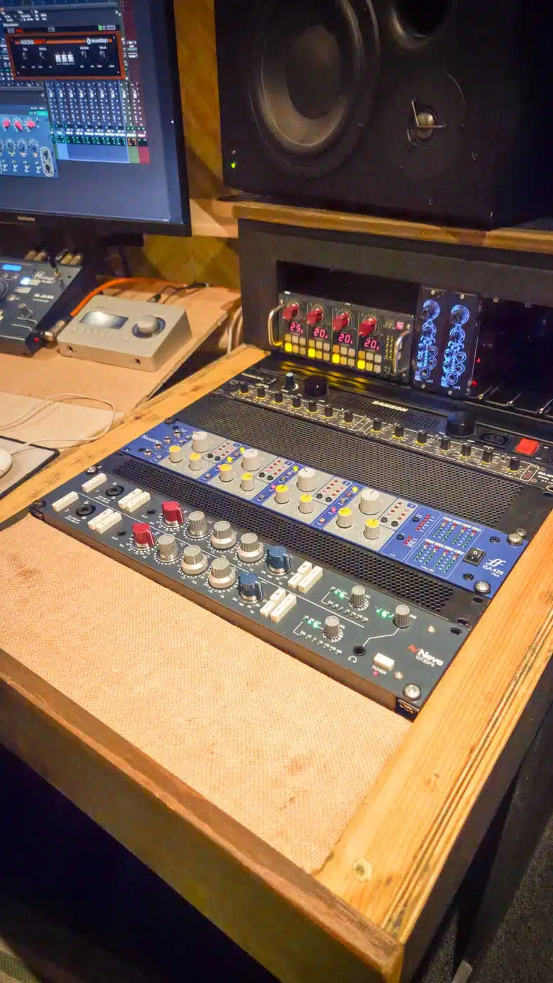 The control room features a custom designed ‘wrap around’ desk housing a Trident 65 recording console and a variety of high end outboard and preamps. But we know sometimes all the modern producer needs is a space between the speakers to put their laptop down and get to work – relax, we have that too!