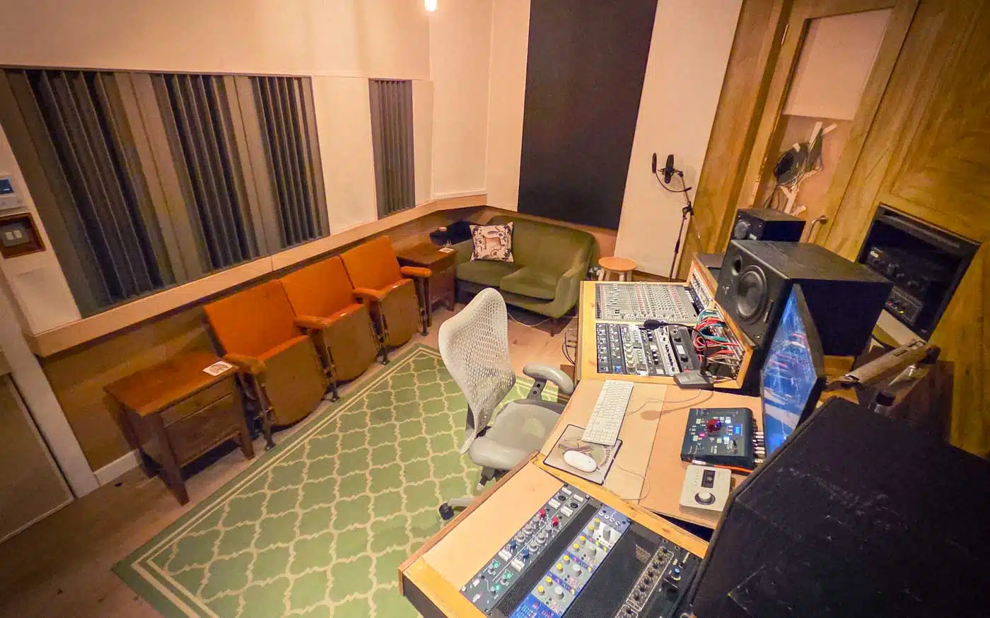 A generous sized window provides excellent sight lines through from the control room to the live room, which itself has 2 large windows providing natural light throughout. Acoustically the live room provides both dryer and wetter areas, and also a vocal booth for when greater separation is needed. The booth is large enough to house a drum kit or piano depending on requirements.